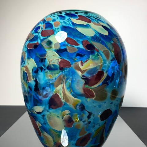 Unik skulptur i massivt glas, arbejdet i flere brændinger, med dekorationer i opalinske farver og gennemsigtighed med relief i materialet.