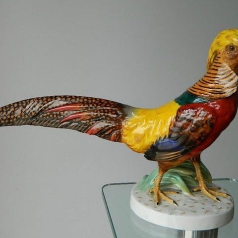 Sjældent porcelænsfasanpar fra Unterweissbach, Tyskland, i meget god stand med let slid og ældningsspor; mål 32,5 × 20 × 13,5 cm; periode 1960–1970. Klik på den blå "gå til varen" knap, for at købe eller byde på denne vare. Den samlede pris vil blive vist inden du afgiver dit bud.