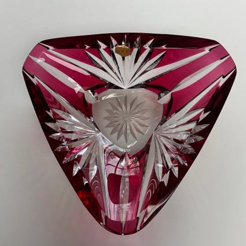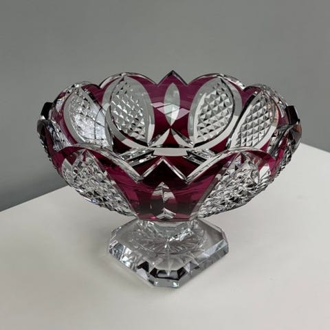 Val Saint Lambert Villencourt krystal-skål i lyserød-fuksia med dyb lyserød kerne, mål: højdem 28 cm, bredde 41 cm, dybde 25 cm, i perfekt vintagestatus. Klik på den blå "gå til varen" knap, for at købe eller byde på denne vare. Den samlede pris vil blive vist inden du afgiver dit bud.