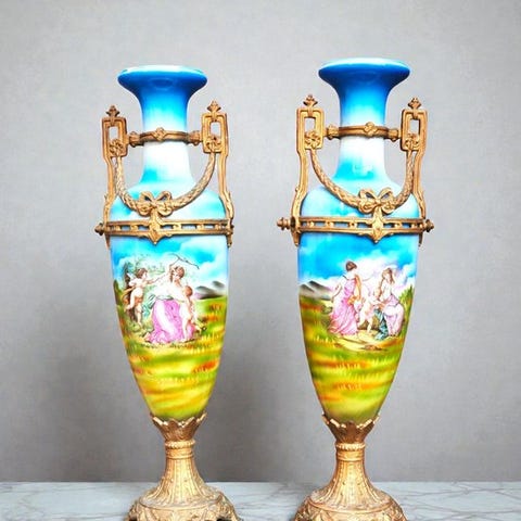 Meget smuk porcelænsgenstand, håndmalet, der forestiller en dame og en ridder i en renæssanceomgivelse.