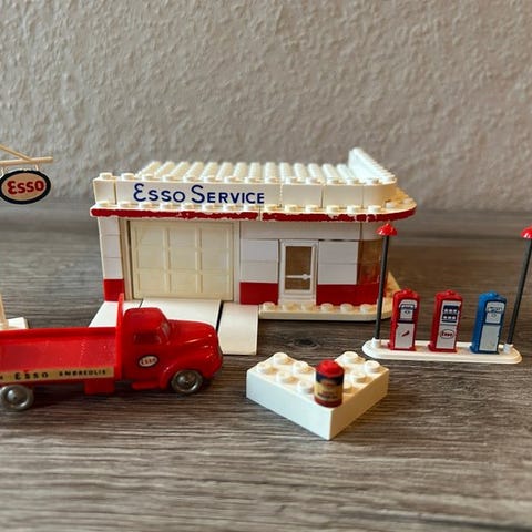 Fuldt LEGO-sæt 307 fra 1958 - VW Car Showroom i top stand.