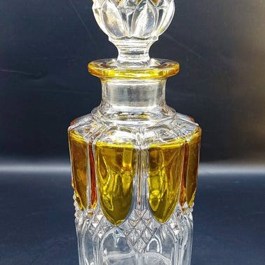 Fire gule Baccarat-krystalgenstande i Art Déco-Bambou-model fra Frankrig, bestående af tre flasker med propper på ca. 16 cm, 14,5 cm og 13 cm samt en barberknivsholder på ca. 12,3 x 9 x 16,5 cm; Baccarat déposè-stemplet på holderen; i fremragende stand med minimale slidmærker. Klik på den blå "gå til varen" knap, for at købe eller byde på denne vare. Den samlede pris vil blive vist inden du afgiver dit bud.