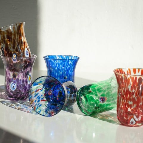 Elegant, raffineret, holdbart ... Smukke Murano-glasbordglas i krystal med pletter fra det prestigefyldte Effetre Murano. Designet af Mar'yana Iskra, en ung designer med en kunstgrad fra Skt. Petersborg og en passion for Murano-glas, hvor hun samarbejder med mange mestre. Disse glas er frugten af Mar'yanas kærlighed til Murano-glas og maleri. Når Mar'yana designer glas, er der kun lidt tid til at forene sin stil med Murano-mesterens hånd. Der er ingen tid til refleksion, og det er her, glassets magi ligger, i en stil formet af instinktivitet. Sikkert pakket, ideelt til restauranter og barer. De er meget værdsatte som gaver. Glassene er holdbare og tåler
