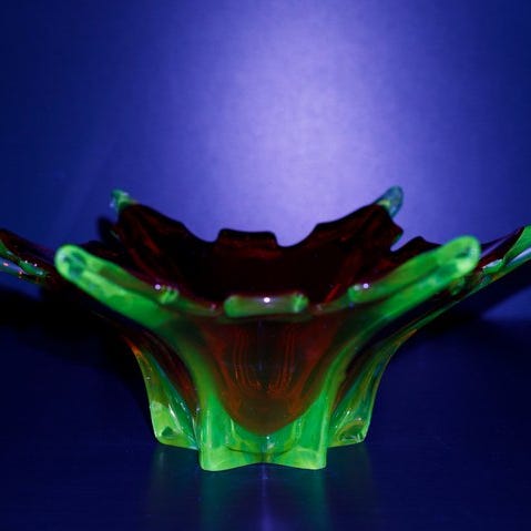 De små mængder uran i glasset får denne figur til at gløde strålende grønt i UV-lys.