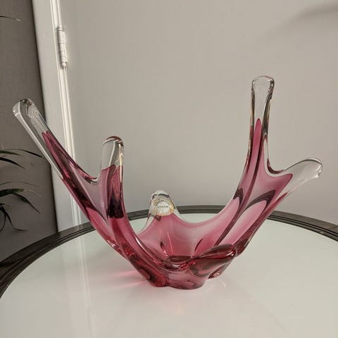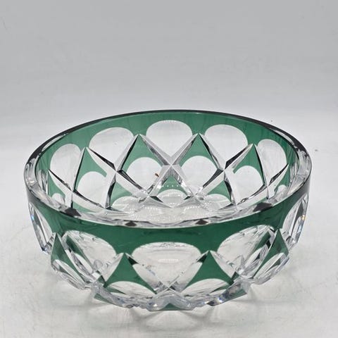 Smuk vintage krystalskål fra det anerkendte belgiske hus Val Saint Lambert, dateret til 1960'erne. Denne mediumstore frugt skål har en elegant trekantet form med afrundede hjørner og et dynamisk swirl-design, der minder om en spiral – et tidløst og stilfuldt stykke. Udført i klart smaragdgult krystal og signeret af kunstneren i bunden. Skålen er i god vintage stand med lette brugsspor, herunder nogle overfladiske ridser på undersiden, hvilket er passende for objektets alder.