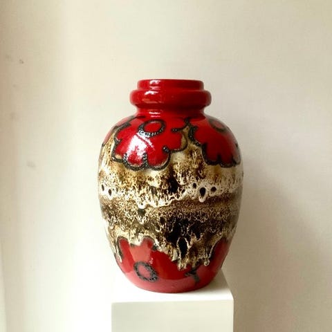 Fohr keramisk Fat Lava gulvvaske af teryk, Tyskland, rød glasur med sorte detaljer, 41 cm høj, 26 cm i diameter, åbning 12 cm, bund 15 cm, vægt ca. 4 kg, årstal 1970–1980, god stand med en ca. 1,5 mm skramme. Klik på den blå "gå til varen" knap, for at købe eller byde på denne vare. Den samlede pris vil blive vist inden du afgiver dit bud.