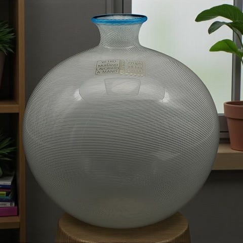 Spring tilbage til Venedig i 90'erne, og du vil finde fantastiske vaser lavet af en mand, der besad kunstnerisk talent og karakter. Disse glas er fremstillet i fantastiske transparente farver: rubin og grøn. Disse vaseglas er valgt fra hjertet af mig selv, produceret med teknikken rigadin, som Carlo Scarpa elskede. Vaso Murano, mundblæst og håndfærdiggjort. Dekoreret med guld af venetianske glarmestre.