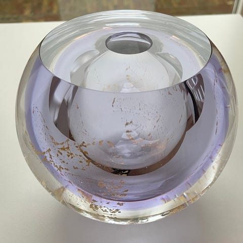 Unikt glasobjekt 'TEA' af den tjekkiske glaskunstner George Broft Unique, mundblæst, poleret og slebet, i klart og lysebrunt glas med gyldent folie mellem lagene, undersiden signeret med diamantstift; højden 16 cm, diameter 16 cm, vægt omkring 2,9 kg, i fremragende stand. Klik på den blå "gå til varen" knap, for at købe eller byde på denne vare. Den samlede pris vil blive vist inden du afgiver dit bud.