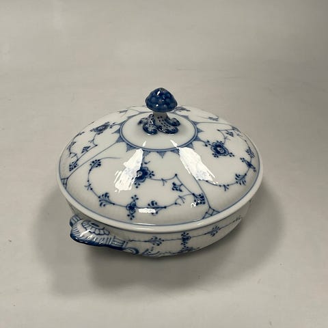 Royal Copenhagen Musselmalet Riflet Hotel The Kande No. 2220 Måler 12,5cm / 4.92 inch høj Har et afslag på låget