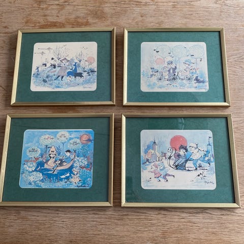 Indrammede billeder af de 4 årstider fra Bjørn Wiinblad, måler 31.5 cm x 26 cm hver. I gyldne rammer jeg sælger dem til 550 kr