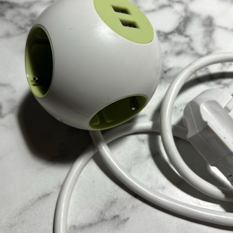 Praktisk 5-vejs stikdåse med USB stik, uden jord, har 5 runde udtag