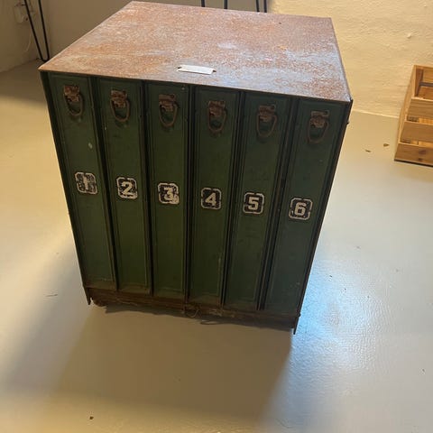 Vintage metal skab med seks rum, nummereret fra 1 til 9 med en trætop. Skabet har en industrielt look og kan bruges til opbevaring i forskellige rum, eller til køkken ø da der er låger på begge sider