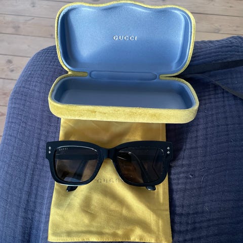 Gucci solbriller til kvinder. Brillerne har en sort ramme og medfølgende etui med Gucci-logo. Designet til at beskytte øjnene mod sollys.