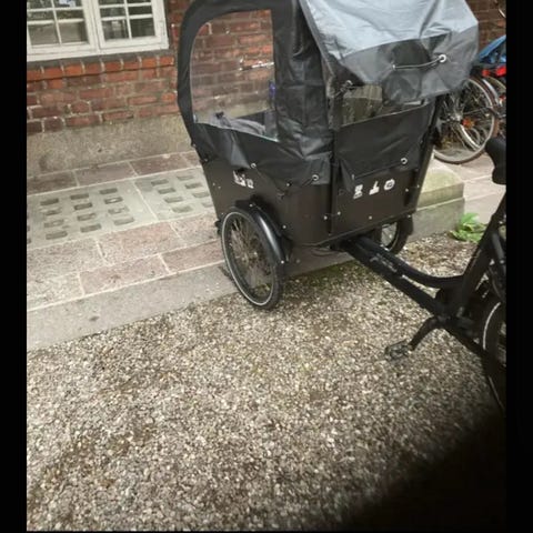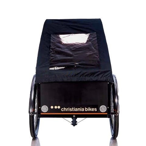 Kaleche til ladcykel i sort med gennemsigtige plastvinduer. Designet til at beskytte mod vejrforhold under cykelture. Materialet er holdbart og velegnet til udendørs brug.