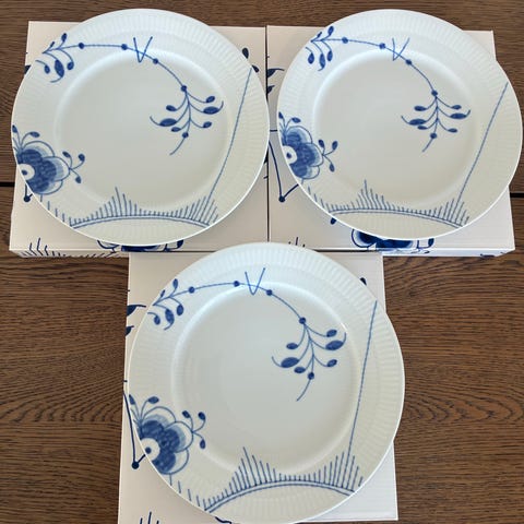 3 ubrugte Royal Copenhagen Blue Fluted Mega tallerkener 22cm. Spar lidt over 150kr relativt til det billigste sted på nettet (Magasin hvor de koster 555kr pr. stk. på tilbud).