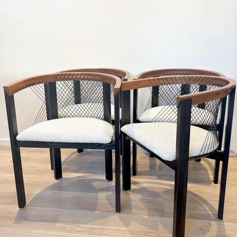 4 vintage trådnet/stålrørs stabelstole & lampe