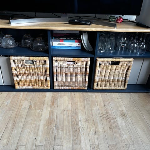 SKRUVBY Tv-bord, hvid, 118x38x60 cm, god stand.