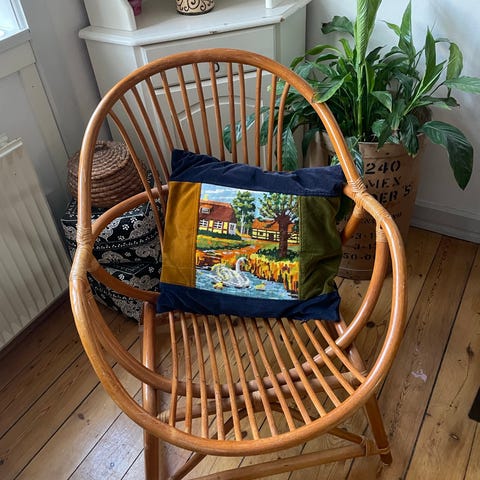 Bambus stol sort med højt ryglæn og hynde der passer.