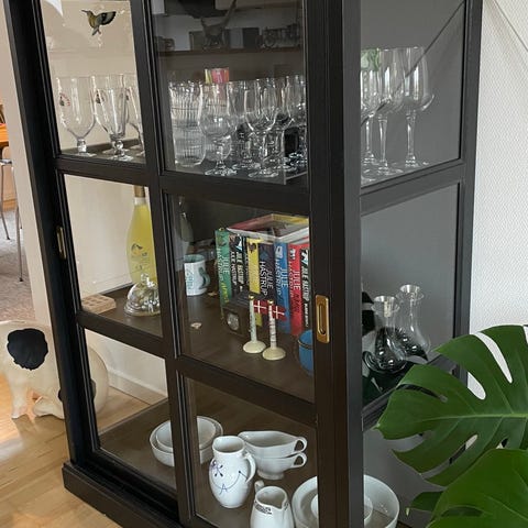 Sort skab med skydelåger af glas. Den ene metal-dims, der hvor man åbner lågen mangler (se billede), men det har ingen praktisk betydning.
