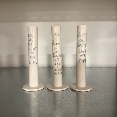 You Little Teapot lysestage/vase af Lars Rank med blå skrift “Du er noget helt særligt for mig”