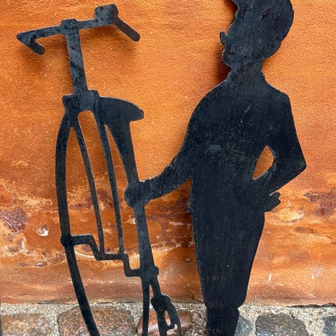 Skilt med teksten 'Henstilling af Cykler og Barnevogne forbudt. Fjernes uden Ansvar.' uden yderligere angivne specifikationer eller materialer. 25x15 cm