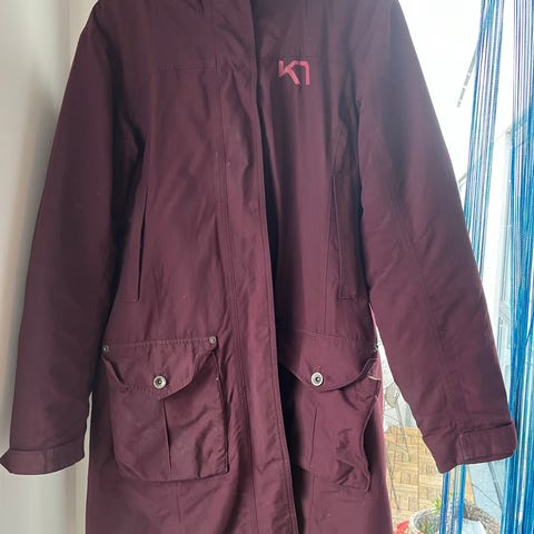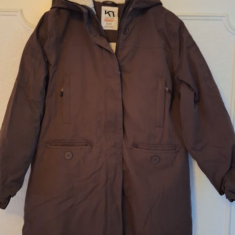 Kari Traa Vinterjakke til kvinder i størrelse M, lavet af polyester. Jakken har en grøn og en beige farve. Den beige del kan fremstå en smule misfarvet nogle steder, men er ikke prøvet at fjernes. Har ikke kunnet taget et ordentligt billede af det.