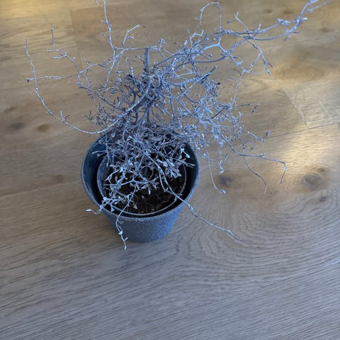 Dekorationsplante i sort plastik og sort potte (er støbt fast i potten).