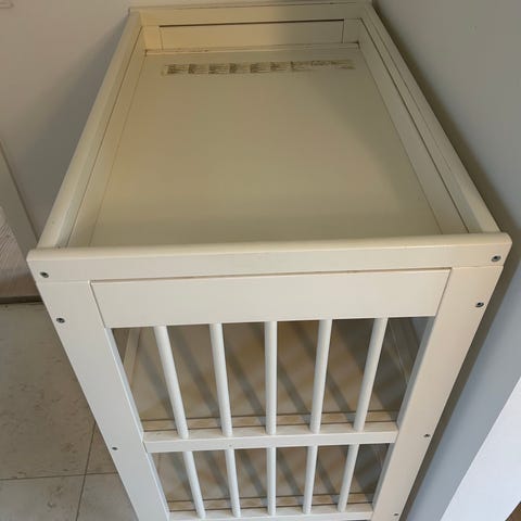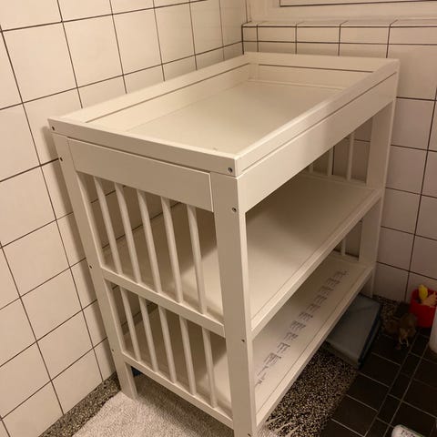 IKEA GULIVER skiftebord / puslebord i hvidt træ med flere hylder til opbevaring. Designet til børn, velegnet til pusling og opbevaring af babyartikler.