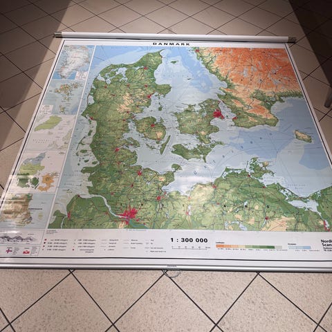 Danmark vægkort med detaljerede geografiske oplysninger, viser øer, byer og topografi. Kortet inkluderer også mindre indsatser med Færøerne og Grønland . Velegnet til undervisning, planlægning eller som dekorativt element.