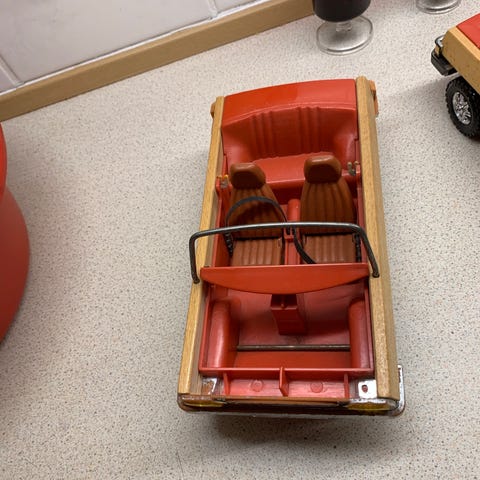 Legetøjsbil i hvid farve med detaljer på motorhjelm og tag. Modellen er lavet af plastik og metal og har hjul, som tillader bevægelse. Velegnet som samleobjekt eller til leg. Jeg sender gerne