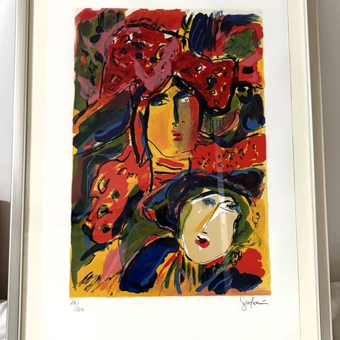 Signeret litografi med motiv af et portræt i abstrakt stil. Billedet er indrammet i en guldfarvet ramme. Litografiet er nummereret og underskrevet af Gina Pellon