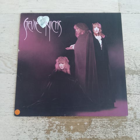 Stevie Nicks vinylplader med forskellige albumcovers og labels. Indeholder flere plader med forskellige udgivelser og artwork. Passer til samlere eller musiklyttere, der er interesserede i Stevie Nicks' musik.