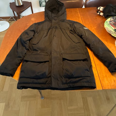 Peak Performance Frost Down H jakke i sort til herre, størrelse L. Jakken er lavet af dun og designet til udendørs brug. Højre lynlåslomme lukker kun med besvær.