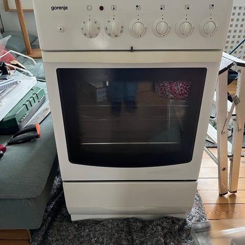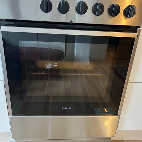 Pænt og rent gaskomfur med 4 kogeplader og en eldrevet ovn.