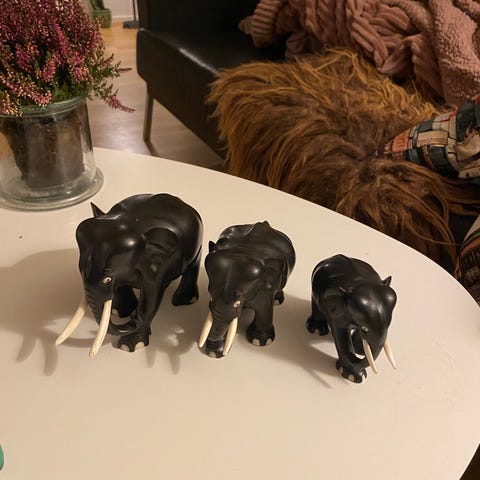 Sæt bestående af tre håndskårne elefantfigurer lavet af træ. Figurerne varierer i størrelse og har en mørk, naturlig træfinish. Velegnet som dekorative genstande til hjemmet.