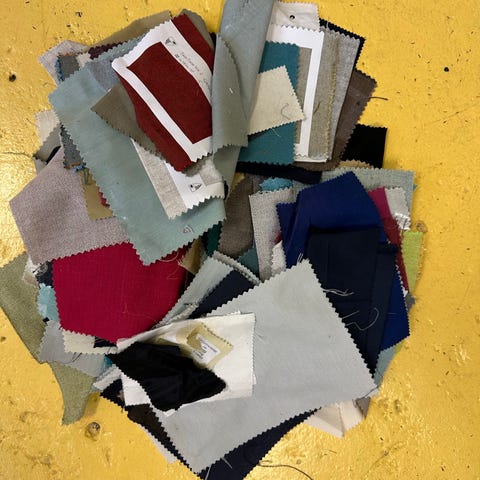 Stor samling af skønne vintagestoffer, med mange forskellige stofstykker i flere mønstre og farver. Stoffernes materialer og størrelser varierer, og de kan anvendes til forskellige syprojekter eller hobbyarbejde.