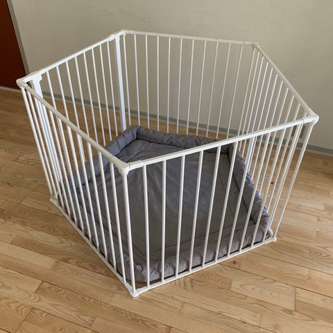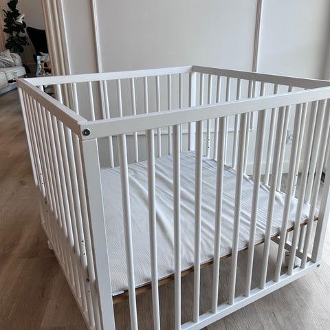 BabyDan kravlegård i hvidt træ med hjul og madras. Bunden kan hæves og sænkes i to niveauer. Næsten ikke brugt.
