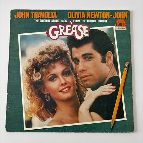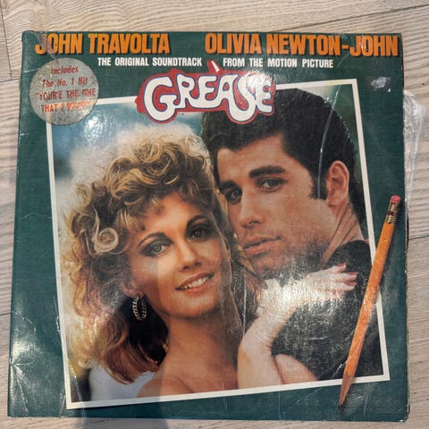 Soundtrack til filmen Grease med John Travolta og Olivia Newton-John. Vinylplade med cover, indeholdende musikken fra filmen.
