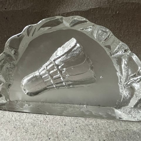 Søgeord: Svensk glaskunst, Glas, Glass, Glaskunst, Kunstglas, Brevpresser, Bogstøtter, Sleben, Slebet, Krystal, Krystalglas, Kunstglas, Glaspuster, Krystalkunst, Glasbruk, Orrefors, Sea Glas Bruk, Kosta Boda, Sportskunst, Dekoration, Pyntegenstande, Kunst, Sport, Badminton, Fjerbold, Gave, Sportsgave, Ketsjere, Badmintonketsjere