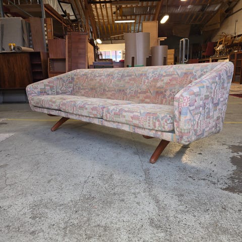 Elegant 2-personers sofa af Illum wikkelsøe i mørkt ædeltræ ( evt teak) og med kongeblå nybetrukne hynder.