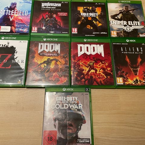 Samling af Xbox One spil med forskellige titler og genrer. Spil til Xbox One konsol og til Xbox Series X.