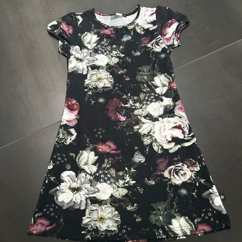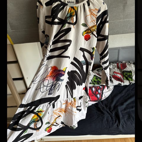 Molo kjole i størrelse 140 til piger. Kjolen er fremstillet i bomuld og har multifarvet design med blomster og dyreprint. Den har kortærmet overdel i lilla og en bred, plisseret nederdel med detaljer i grønne og farverige nuancer.