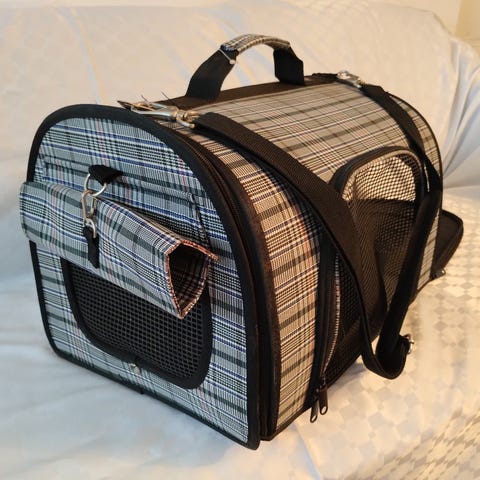 Brugt én gang! Anione Transporttaske Anton til kæledyr op til 7 kg. Tasken er lavet med blødt fleeceindlæg for komfort og har meshvinduer for optimal luftcirkulation. Den har åbning i toppen og på forsiden for nem adgang. Tasken kan også bruges som bæltetaske til cykler med integreret køresele og reflekser. Kan medtages som håndbagage i fly med hensyn til flyselskabets regler.