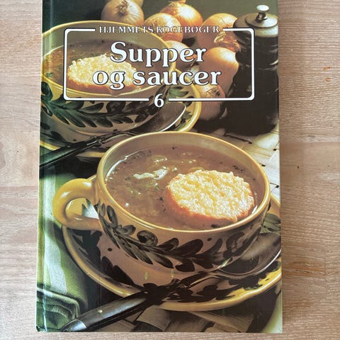 Supper & Saucer Menu kogebog med opskrifter til supper og saucer. Indeholder forskellige retter og madlavningstips. Bogen er på dansk og illustreret med billeder.