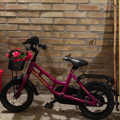 Winther børnecykel med 12 tommer hjul i blå farve. Cyklen er designet til børn og har en ramme og komponenter tilpasset denne størrelse. Medfølgende støttehjul og en støttebøjle til ekstra balancehjælp under kørsel.