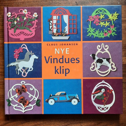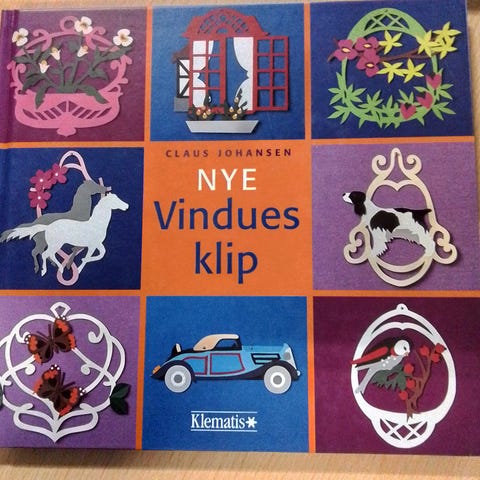 Klaus Johansen Vinduesklip bog med forskellige mønstre til vinduesudsmykning. Indeholder illustrationer og vejledning til at klippe og dekorere vinduer med papirfigurer. Bogens sider viser både tegninger og færdige eksempler.
