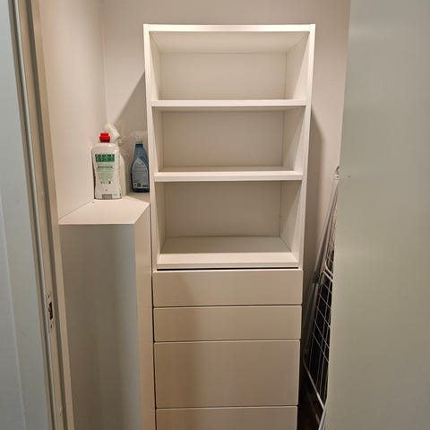 Platsa skab (h 180 cm) og overskab (h 40 cm) sælges. I god stand, men med slid fra låger og en enkelt lille revne i bagepladen.