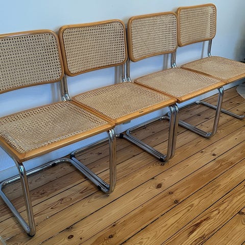 Én stol har et mindre hul på fletten på ryglænet, se sidste billede.