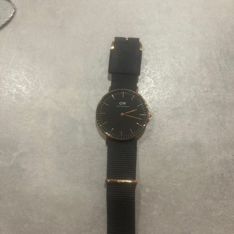 Daniel Wellington herreur med hvid urskive og blå-hvid rem. Uret har et minimalistisk design og er beregnet til mænd. Ingen tydelige ridser. Remmen er helt fin