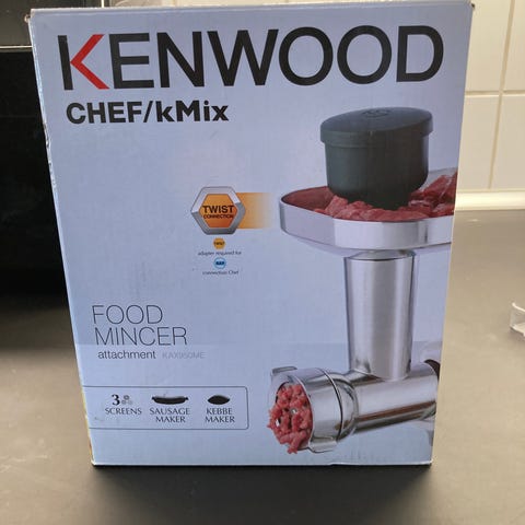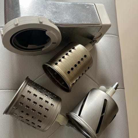 Kenwood foodprocessor tilbehørssæt bestående af flere rive- og skiveskiver, blenderkande i glas, samt forskellige knive og tilbehør. Sættet indeholder dele i plast og metal, egnet til brug med Kenwood foodprocessorer.
